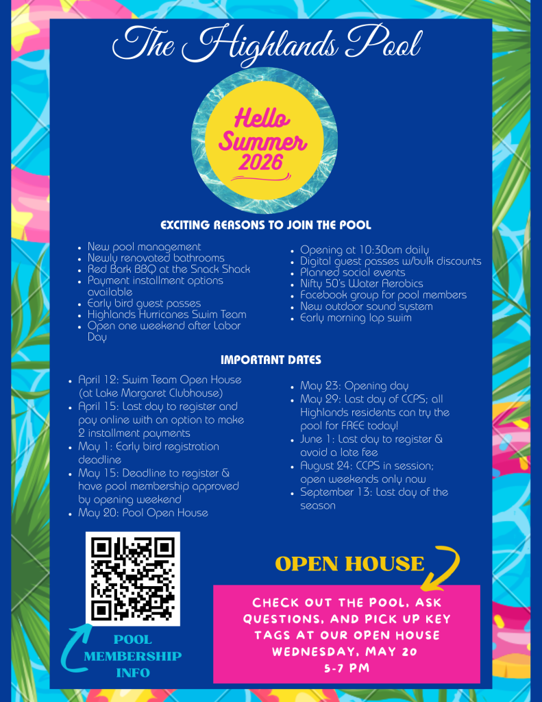 - May 29: Last day of CCPS; all Highlands residents can try the pool for FREE today!